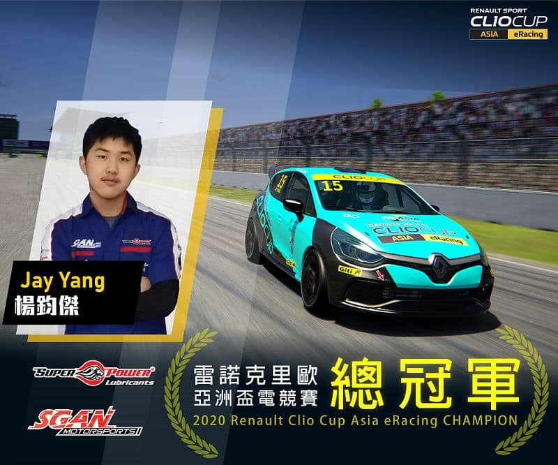 Renault Clio Cup 部分,車隊17歲主力車手 Jay 楊鈞傑 雖然每場分站都能穩定站上頒獎台,但與競爭對手實力非常接近,在整個賽季中形成積分拉鋸戰,最後以些微的差距贏得SIM(電競車手)組及整體排名的總冠軍,並獲得真實雷諾 Clio Cup 廠車珠海賽道試車體驗資格的獎勵。